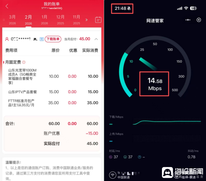 海报新闻记者孙来宾见习记者尚毅济南报道如今,水、电、煤气等宽带网络已经成为家庭生活的必需品。但是,当消费者花真钱购买标榜“千兆速度”或“仅限光纤”的服务时,他们经常会在晚间高峰时段遇到延迟和断线情况。今年“3月15日”前夕,记者通过众多用户的真实体验,揭开了围绕千兆宽带的一层迷雾。所谓“入户光纤”实际上是“共享架构”,更令人震惊的是,为了掩盖服务质量问题,维修人员给用户发短信,赠送300元话费,并鼓励用户下次来访时给予“满分”评价。每月宽带费用和数据流量Mr.林夜速咳嗽。千兆宽带成为“龟速”,最高速度仅为14Mbps。 Lin 对 h 有一些网络需求是用于工作目的的家用计算机。每月花45元激活中国联通FTTR光纤到户千兆宽带。然而,他的网上经历却呈现出一种奇怪的“潮汐现象”。白天测速软件显示网速正常,跑到千兆。但一旦我们到达黄金时段,即晚上 7 点。米。至中午 12 点米。每天晚上,网络速度都会急剧下降,延迟也会飙升。以去年10月某日晚上9点48分林某的测试为例。实测网络速度仅为14.58Mbps。这种周期性麻痹,导致林某多次参与抢购热门产品,网上购物却因网络加载错误而导致产品缺货。 “买不起,买不起”成为他始终的担忧。当林某打电话给客服报修时,维修人员到了门口也找不到原因。相反,他们将问题归咎于美国Ser的电脑。 “我懒得去处理,因为他们解决不了真正的问题。” 3月11日,林告诉记者,他购买的所有设备都是高性能产品。即使执行诸如重新启动路由器之类的基本操作也无法解决实际问题。此外,维修人员还反映,多次报修后,还是同一个人来维修,导致用户重复投诉,导致用户的钱被扣。于是,林先生再次致电客服。联通客户要求更换具有专业技能的工程师上门排查问题。经过进一步排查,联通技术人员怀疑问题出在联通定制路由器上。林先生被告知,路由器型号、版本和终端设备连接之间的兼容性问题可能会导致不同设备之间的连接异常。当我使用它时,它突然断开连接,然后连接获得。林说,问题终于解决了,问题还在继续。工作人员还报告了解决路由器问题的困难。值得注意的是,林某曾向中国联通客服询问光纤到户方案,询问家中是否还有另一根光纤,或者整个楼宇或小区是否共用一根光纤。客服说:“我不知道,也无法回答你的问题。”安装人员说:“我一个人进了屋。”看到这种矛盾的反应,林某回想起去年罗永浩曝光的网络问题,怀疑是夜间高峰时段共享带宽拥堵造成的。晚上,当每个人都共享块时,互联网速度会降低。当没有人使用时,您的互联网速度会更快。 故障排除就像“挤牙膏”,维护就像“花钱买好评”。林先生的经历并非孤例。刘先生(华姓)的经历ce透露,运营商对设备兼容性和服务标准存在双重困惑。刘家智能家居设备较多,对网络稳定性要求较高。然而,有了移动宽带,电视屏幕会旋转,而智能音箱“不会醒来”,窗帘关闭并停止响应。类似这样的问题经常发生。 2026年3月2日,刘某拨打智能音频设备时遇到网络延迟。 “我给手机公司提供了三四次信息,师傅在2025年2月28日第一次来清除缓存,工作了大约一周,但即使之后网速很差,我根本无法使用我的智能家居。”刘先生告诉记者,不久后他就到营业厅升级了千兆网速套餐,但网速仍然不好。 “运营商笑了,虽然他升级了千兆套餐,但他说网线不是千兆。”十二月2025年12月2日,刘先生再次投诉后,维修人员上门检查,称路由器和电脑有问题。如果您想提高互联网速度,则必须购买新设备。刘先生表示,设备已经很久没有使用了,频繁更换会增加使用成本。 “到目前为止,家里的智能音箱经常无法响应呼叫。”这种“挤牙膏”的问题解决不仅没有解决根本问题,还不断加重用户的经济负担和心理焦虑。但最令刘先生惊讶的是,维修人员在维修后的第二天就发来了两条一模一样的短信。他在短信中恳求刘给所有来自外省的以010、95或12304开头的固定电话的“移动宽带”评级为10分。他还承诺,如果验证成功,将给刘先生300元话费。 “EThis 是个人短信中的“对我很重要”表明,上门维护人员试图通过“花钱买好评”来掩盖网络质量不过关的荒谬现实。刘先生提供的移动维护人员发送的短信截图。宽带网络为移动、联通、电信三大运营商。李先生的经历,从另一个角度体现了宽带服务的“速度陷阱”,作为一名长期电信用户,李先生亲眼目睹了从100M到千兆的演进,但网速不稳定一直是她的困扰。我家的宽带通常是三四部手机同时使用,下班后的网络使用高峰时段,网速会变慢,有时还会掉线。”李告诉记者,他使用的移动电信套餐价格为每月169元,并配有两台千兆宽带,安装在他和父母家中。 “总之,网速不行很好,所以我就接受了。更换运营商很痛苦。没有人知道中国移动和中国联通(网速)哪个更好。”李先生很无奈。李女士反映,她家里的网速总是很慢,网络设备经常出现故障。兼容 3 或 4 部手机和平板电脑。记者调查时发现,有更换设备后网速变快的情况。 “去年夏天,我感觉家里的网速宽带质量很慢。当时我有100Mbps的宽带,下载速度只有几百K每秒。有时能达到1-2Mbps。”冯先生告诉记者,起初,他认为宽带速度慢,于是改用了其他运营商的千兆宽带,但升级后的效果并不理想。基于上述情况,当地运维人员提醒冯先生,是否是自家路由器