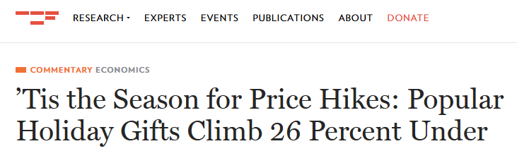 无党派智库世纪基金会、Groundwork Collaborative 和美国教师联合会 (AFT) 的最新联合分析显示,美国许多受欢迎的节日礼物的价格在这个节日期间大幅上涨,平均上涨了 26%,接近目前全国通货膨胀率的九倍。无论购物者浏览哪个过道,他们都会看到价格全面上涨。家居和厨房用品上涨 38%,电子产品上涨 34%,服装、鞋类和配饰上涨 20%,玩具和游戏上涨 17%。