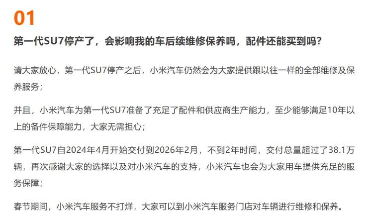 2月12日晚,小米汽车公布了网友提问的解答。文章称,即使第一代SU7停产后,小米汽车仍将一如既往地提供所有维修和保养服务。并且小米汽车为第一代SU7准备了充足的配件和供应商产能,可以满足至少10年的零配件保修能力。无需担心。此前报道:据雷军透露,全新一代SU7将于2月13日开始在门店亮相,首批将在北京、上海、广州、深圳、杭州、成都、武汉等地区门店展示。雷军表示,春节期间,小米汽车销售服务店将按照正常营业时间提供服务,覆盖158个城市的275家服务中心参与,提供上门机电等快修服务医疗和移动维修。图片来源:雷军直播截图 2月1日,小米汽车官方宣布,1月份销量突破3.9万辆,较2025年12月的5万多辆交付量下降22%。对此,雷军表示,目前的销量得益于订单深度和市场认知度。由于SU7正处于新旧过渡阶段,本月主要交付车型为YU7。全新一代SU7将于4月上市。该品牌2026年的销售目标是55万辆。 2025年,小米计划交付超过41万辆汽车。来源:红星新闻 通用小米汽车