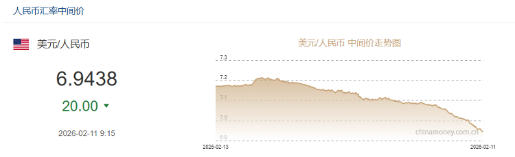 临近年底,人民币延续去年底以来的升势。中国人民银行授权中国外汇交易中心发布消息,2月11日人民币对美元汇率中间价上涨20点至6.9438,创2023年5月11日以来新高。2月11日人民币对美元即期收盘价为6.9115。资料来源:中国外汇交易中心 自2025年11月中旬以来,人民币开启了大幅升值轨道,不断突破7.10、7.05等多个重要关口。到2025年底,人民币兑美元境内外汇率均“破7”。今年1月,人民币兑美元汇率中间价“悄然突破7关”。 2月11日,受人民币升值消息影响,造纸生产积极性被激活。蔡rn股份盘中涨停,岳阳林纸、华泰纸业、博汇纸业、恒大新材、景兴纸业、太阳纸业紧随其后。资料来源:Wind 人民币升值有助于纸企降低外贸采购成本,优化利润。主要造纸商太阳纸业宣布,人民币强势对造纸行业的影响将主要体现在原材料成本下降和外汇收入上升,但具体影响将取决于公司的进口依存度和财务结构。进入2026年以来,人民币自“突破7美元关口”以来一直处于高位状态,未来是否有可能维持在7.0以上的水平? “近期人民币升值主要是由于美元疲软以及春节前出口和消费的季节性因素。”摩根士丹利首席中国经济学家习近平在2026中国首席经济学家论坛上自强表示,今年人民币仍有升值空间,短期内一二季度可能达到6.8元左右,但年底仍存在不确定性。前海开源基金首席经济学家杨德龙表示:“人民币升值趋势已经形成,未来不会改变。”杨德龙预测:“有可能升至6.8,甚至6.5。”最终峰值在6.2英寸左右(大众新闻记者杜亚男)