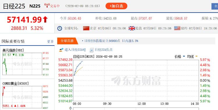 涨幅超5%!日经平均指数创57,000点新高