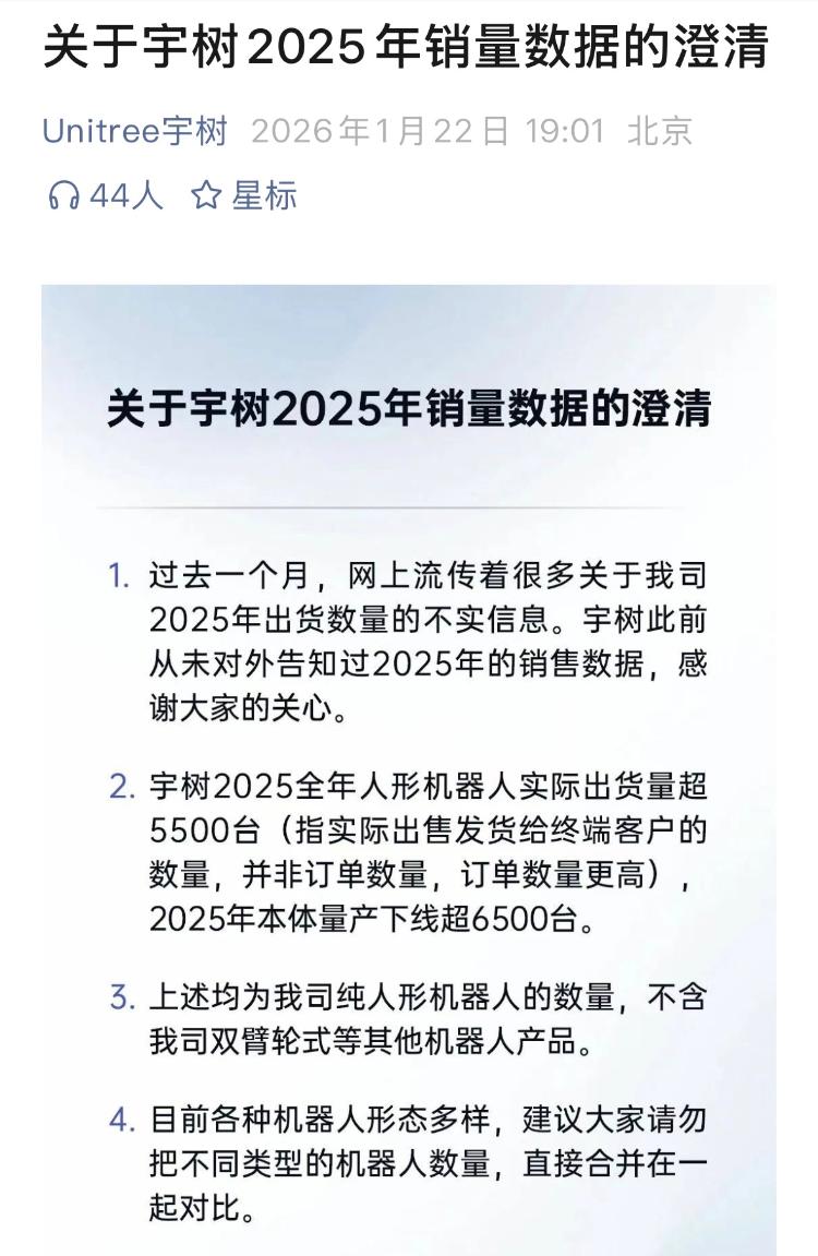 红星资本局1月22日晚报道称,玉树科技官方微信发布了关于2025年销量数据的解释,上个月网络上流传了大量关于玉树科技2025年出货数据的虚假信息。玉树科技表示,2025年人形机器人实际出货量将超过5500台,量产机器人数量将超过6500台。以上是优秀的纯人形机器人数量,不包括两臂轮式机器人等其他机器人产品。玉树科技表示,5500台并不是指订购数量,而是实际销售并发货给终端客户的数量,这个数字更高。他强调,2025 年的销售数据从未公开过。玉树科技的回应可能与全球市场研究机构Omdia于12月初发布的《通用体机器人市场雷达报告》有关。报告预计,到 2025 年,致远机器人以5,168台位居第一,玉树以4,200台位居第二,优必选以1,000台位居第三。卓越此次公布的销量数据超出了这一数字1000多台。御树科技表示,目前不同类型的机器人有很多,建议不要直接组合或比较不同类型机器人的数量。公开资料显示,玉树科技业务涵盖多个品类,包括四足机器人、人形机器人等。去年9月,玉树科技披露了2024年利润结构,四足机器人、人形机器人及相关零部件的销售额分别占比65%、30%和5%。御数创始人王星星也透露,预计2024年公司营收将突破10亿元,成为行业内为数不多的实现持续营收的机器人公司之一。红星新闻记者 王田
