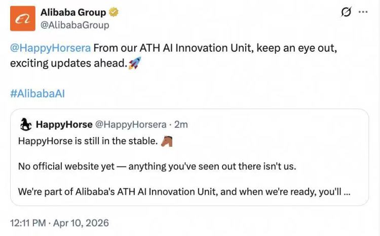 【环球网科技记者 李文耀】4月10日消息,阿里巴巴ATH今日宣布,“HappyHorse是阿里巴巴ATH创新部门开发的车型”。我们目前正在进行内部测试,并计划在不久的将来发布该 API。 ATH创新部门启动了一项计划,探索人工智能时代新的交互方式。 HappyHorse 是这一追求的一部分,我们计划随着时间的推移发布更多产品。近日,在全球知名人工智能测评平台Artificial Analysis的Video Arena榜单上,一款代号为HappyHorse-1.0的神秘视频生成模型在空中悄然飞翔,迅速登上榜单榜首。值得注意的是,在文胜的视频赛道上,他的Elo积分飙升至1357分。 Image Student的视频曲目取得了1402的高分,创下了排行榜新纪录。阿里巴巴ATH(Alibaba Token Hub)是阿里巴巴集团今年3月成立的企业集团。直接地在集团CEO吴永明的带领下,以“通证创造、流通和应用”为核心目标,充分整合核心人工智能资源。